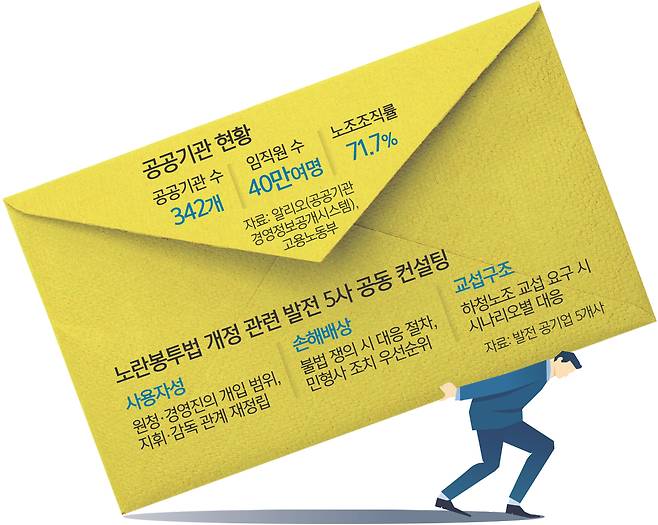 다음 달 10일 노란봉투법(노동조합 및 노동관계조정법 2·3조 개정 법률) 시행을 앞두고 발전 공기업 5개사(남동·중부·서부·남부·동서발전)가 2억3000만원을 들여 공동 컨설팅에 나선 것으로 25일 확인됐다. 노조 조직률이 높고, 비정규직의 정규직화 등 현안이 산적한 공공 부문에서 노란봉투법의 파급력이 막대할 것이라는 분석이 나온다.