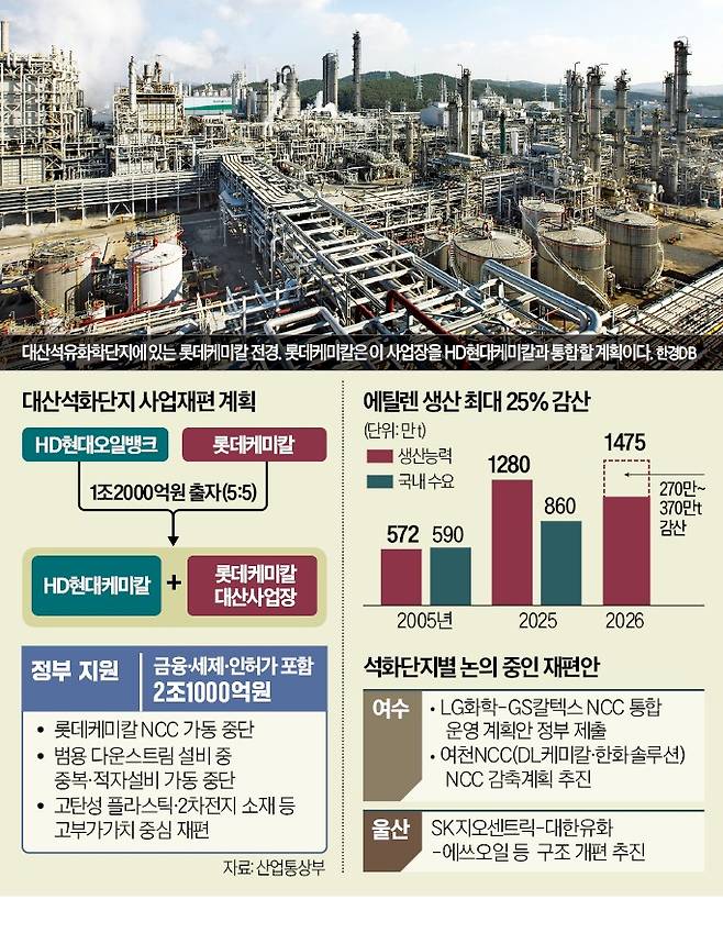 정부가 승인한 1호 석화 사업 재편안의 핵심은 롯데케미칼 대산공장과 HD현대케미칼의 합병이다. 오는 9월 출범하는 ‘대산 통합법인’에 양사는 6000억원씩 총 1조2000억원을 출자하고, 적자 설비를 폐쇄하기로 했다. 1991년 지어진 롯데케미칼 나프타분해설비(NCC)는 가동을 중단하고, 두 회사의 NCC 설비용량은 기존 195만t에서 85만t으로 대폭 줄어든다. 석유화학업계가 앞서 정부에 제출한 전체 감축안(270만~370만t)의 22%에서 31%에 달하는 규모다.