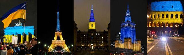 우크라이나 전쟁 발발 4주년을 맞은 24일(현지시간) 유럽 각국 대표 건물들에 우크라이나 국기 색인 파란색과 노란색 조명이 설치됐다. 왼쪽부터 독일 베를린 브란덴부르크문, 프랑스 파리 에펠탑, 덴마크 코펜하겐 크리스티안보르궁전, 폴란드 바르샤바 문화과학궁전, 이탈리아 로마 콜로세움. 이날 뉴욕 유엔본부에서 열린 유엔총회에서 우크라이나의 주권과 독립, 영토보전을 지지하는 결의안이 찬성 107개국, 반대 12개국으로 채택됐다. 미국과 중국 등 51개국은 기권했다. 유엔총회 결의는 안전보장이사회(안보리) 결의와 달리 국제법상 구속력은 없지만 다수 회원국의 의지를 반영한다는 점에서 정치적·외교적인 의미를 지닌다. APAFPEPA로이터연합뉴스