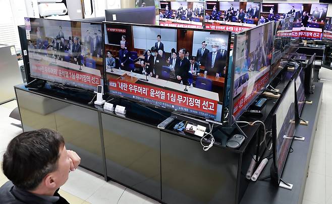 | ▲ 내란 우두머리 혐의를 받는 윤석열 전 대통령의 1심 선고일인 19일 서울 용산 전자랜드 가전 매장에 진열된 텔레비전에서 나오는 선고 공판 생중계를 시민이 지켜보고 있다. |