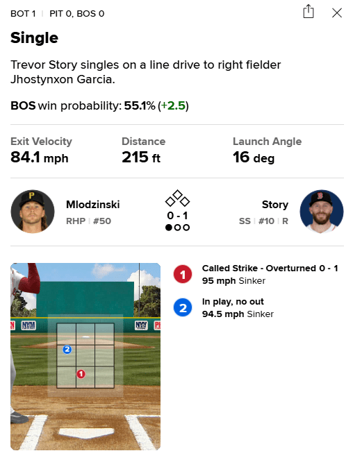 1회 말 1사 주자 없는 상황에서 트레버 스토리가 타석에 섰다. 피츠버그 선발 투수 카멘 머진스키가 초구로 시속 95마일(약 152.9km)의 싱커를 던졌다. 가운데에 공이 꽂혔으나 심판은 볼을 선언했고, 이에 포수 엔디 로드리게스가 곧바로 챌린지를 요청했다.