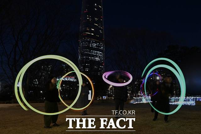 정월 대보름을 약 일주일 앞둔 25일 오후 서울 송파구 석촌호수 '더 스피어(The sphere)'에서 시민들이 LED 쥐불놀이를 돌리고 있다.