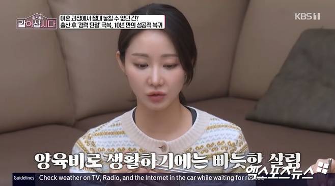 앞서 지난달 KBS1 '황신혜의 같이 삽시다'에 출연한 그는 "이혼하고 돈이 한 푼도 없어서 양육비 받은 게 빠듯하게 나가고 여유가 없었다. 재산분할을 안 했다"고 회상했다. 이후 중단했던 연기 활동을 시작했다고.