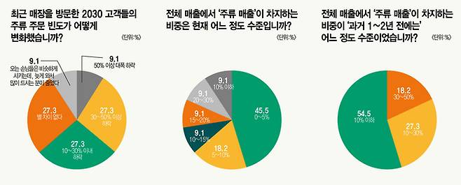 소버 큐리어스 현상은 숫자로 증명된다. 국세청이 발표한 ‘2025년 12월 100대 생활업종 통계’에 따르면 간이 주점 사업자 수는 전년 동월 대비 10.4% 감소했다. 호프 주점은 9.5%, 기타 음식점도 5.2% 줄었다. 주류를 취급하는 외식업 현장의 프랜차이즈 대표, 다점포 점주를 대상으로 매경이코노미가 설문한 결과는 더욱 심각하다. 11명 중 8명이 ‘주류 매출이 감소했다’고 응답했다. 이 중 3명은 30% 이상, 1명은 50% 이상 주류 매출이 급감했다고 밝혔다.