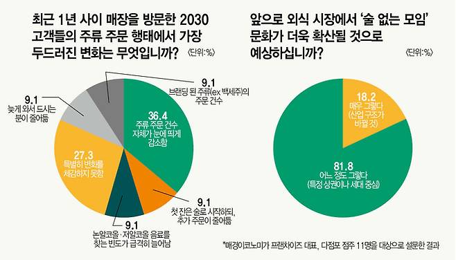 주요 변인은 MZ세대의 주류 기피 문화가 지목된다. NH농협은행 트렌드 보고서에 따르면 지난해 기준 20대의 주점 소비 금액은 전년 대비 20.9% 급감했다. 30대 역시 15.5% 감소했다. 고깃집, 샤브샤브 등 다점포와 함께 자영업자 2000여명이 활동하는 커뮤니티를 운영하는 이호영 자연샤브 대표는 “2030세대 고객들의 주류 주문 건수 자체가 눈에 띄게 감소했다. 전체 매출에서 주류 매출이 차지하는 비중이 10%는 넘었는데 지금은 5%도 채 되지 않는다”고 분위기를 전했다.