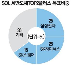 실질적으로는 SK하이닉스 투자 비중이 더 높다. SK하이닉스 투자지주사인 SK스퀘어도 담고 있어서다. SK스퀘어에는 약 15% 비중이 할당될 전망이다. 이 밖에 AI 반도체 가치사슬(밸류체인) 기업 중 매출·주가 모멘텀이 좋은 7종목도 편입된다.
