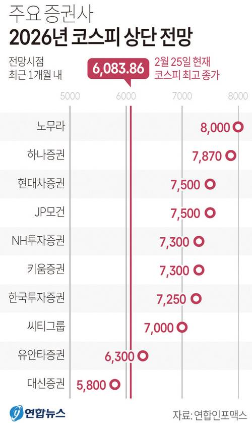 이에 ‘7천피’를 넘어 ‘8천피’까지 바라보는 시각도 나오고 있다. 글로벌 투자은행 JP 모건은 이달 초 코스피 기본 시나리오 목표치를 6천으로, 강세장 시나리오의 경우 7천500으로 상향 조정했다. 씨티그룹도 올해 코스피 목표치를 7천으로 잡았고, 노무라금융투자는 메모리 업종의 이익 확대를 반영해 올해 상반기 코스피 목표치로 최고 8천을 제시하기도 했다. → 그래픽 참조