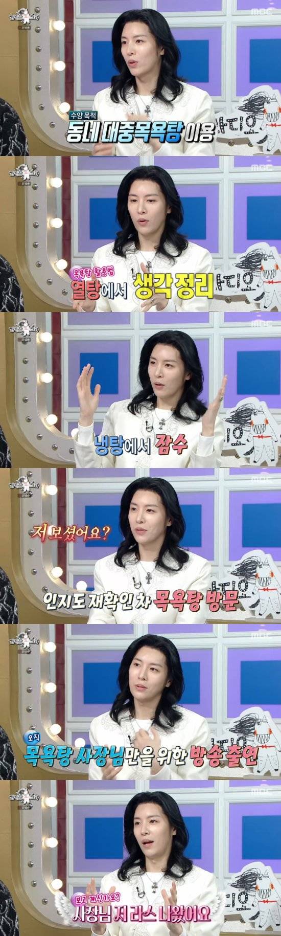 노민우는 "제가 혼자 생활한지 3년이 됐다. 살다보니 생활 패턴이 엉망이 됐다. 정신 수양을 위해 동네 목욕탕을 다니게 됐다. 열탕에서 생각 정리를 하고, 냉탕에 가서 잠수하고 재밌더라"면서 웃었다.