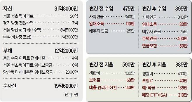 ◆‘재입주’해 주택연금 활용=변동성이 큰 비상장주식(약 1억원)은 팔고 현금 비중을 높이자. 주택과 주식 처분으로 자금을 확보하는 게 좋아 보인다. 전세 생활을 정리하고 서초동 아파트로 재입주하는 재원 및 부채 상환에 활용하는 게 바람직하다. 주택연금도 권한다. 한국주택금융공사(HF) 주택연금은 공시가격 12억원 이하 요건이 있어 한계가 있지만, 최근 일부 은행의 민간형 주택연금은 12억원 초과 고가주택도 대상에 포함된다. 2년 이상 실거주 요건을 충족하면 된다. 서초 아파트 시세가 약 20억원 수준이라면(만 71세 기준) 월 약 400만원의 연금 수령을 기대할 수 있다. 잉여금은 예·적금 및 개인종합자산관리계좌(ISA)를 통한 배당형 상장지수펀드(ETF) 등으로 운용해 안정성을 높이자.