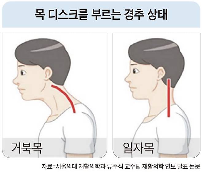 거북목 국민병 현상은 스마트폰, 노트북 작업 등으로 ‘고개 숙인 시간’이 급증했기 때문이다. 여기에 앉아 있는 시간이 늘어난 탓도 가세한다. 노트북은 화면이 낮게 놓여 고개가 자연스럽게 숙여진다. 거기에 소파·침대에서 작업하는 습관까지 겹치면 목은 굽고, 어깨는 말리고, 등은 둥글어진다.