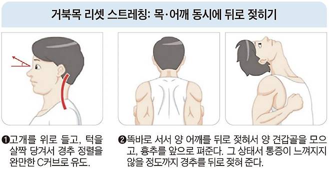 거북목 개선과 예방을 위해서는 목·어깨 리셋 스트레칭, 즉 ‘경추 어깨 동시에 뒤로 젖히기’ 운동이 권장된다. 통상 거북목 개선을 위해 목을 뒤로 젖히는 맥켄지 스트레칭이 권장됐으나, 여기에 어깨를 젖혀서 양쪽 견갑골도 당겨 모으고, 흉추를 앞으로 펴는 운동을 같이 하면, 거북목 개선 효과가 더 커진다<그래픽 참조>