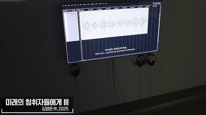 [김영은/미술가 : 맞습니다. 일단 공간 안에 들어가면 2018년에 제작한 '붉은 소음의 방문'이라는 작업이 제일 처음 나타나는데 이 작업은 굉장히 강렬한 붉은 배경색과 함께 통금 사이렌 소리 그리고 또 남북한을 넘나들었던 라디오 소리 등을 재구성한 것들을 같이 들으시면서 영상을 감상하실 수 있고요. 이렇게 과거의 소리와 근과거의 소리를 재구성한 영상 작업 3점이 공간의 가운데에 놓여져 있고, 그것을 다 보고 나서 제일 안쪽으로 들어가시면 방금 말씀드린 '듣는 손님'이 5채널 사운드와 싱글 채널 비디오로 상영이 됩니다. 그리고 전시장을 나오시면서 양쪽에 놓여 있는 미래의 청취자들에게 시리즈를 감상하실 수 있게 배치가 되었는데요. 이 모든 작업에서 소리가 나고 있기 때문에 작업 간의 소리의 간섭을 최소화하는 형태로 설계가 되었습니다.]