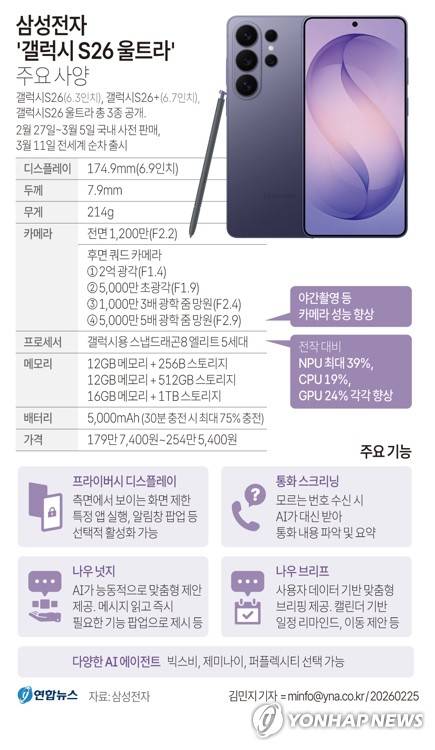 [그래픽] 삼성전자 '갤럭시S26 울트라' 주요 사양