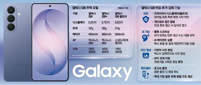 삼성전자는 다음달 11일부터 갤럭시 S26 시리즈를 한국·미국·영국·인도를 비롯한 전 세계 120여 개국에 순차적으로 출시한다. 국내 사전 판매는 27일부터 다음달 5일까지 7일간 진행된다.