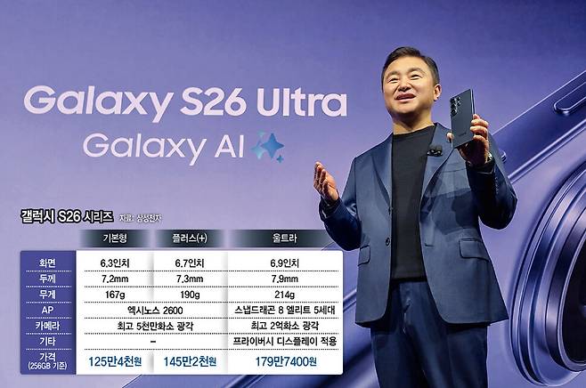갤럭시 에스26은 기본형, 플러스(+), 울트라 등 3개 모델로 이뤄졌다. 기본형 화면이 6.3인치로 이전 세대 대비 0.1인치 커졌다. 최상급인 울트라는 6.9인치로 전작과 같지만, 두께가 기존 8.2밀리미터(mm)에서 7.9밀리미터로 얇고 가벼워졌다.