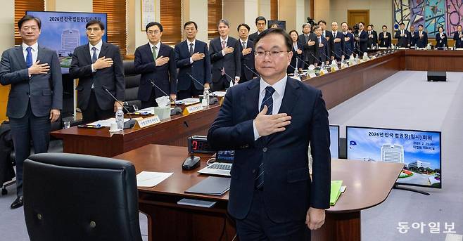| ‘사법 3법’ 논의 전국법원장회의 재판소원 도입과 법왜곡죄 신설, 대법관 증원 등 사법개혁 3법에 대한 대응 방안을 논의하기 위해 25일 오후 서울 서초구 대법원 청사에서 열린 전국법원장회의 임시회의에서 박영재 법원행정처장(앞)을 비롯한 전국 법원장들이 국민의례를 하고 있다. 박 처장은 “법률안을 숙의하는 과정에서 재판을 직접 담당하는 사법부의 의견이 반영될 필요가 있다”고 강조했다. 양회성 기자 yohan@donga.com |
