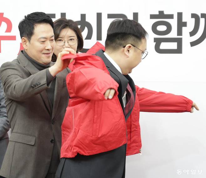| 영입 환영식서 ‘당 점퍼’ 입혀주는 장동혁 국민의힘 장동혁 대표(왼쪽)가 25일 서울 여의도 국회에서 영입 인재 환영식을 열고 정진우 현대엔지니어링 책임매니저(오른쪽)에게 당 점퍼를 입혀 주고 있다. 가운데는 이날 함께 영입된 손정화 삼화회계법인 이사. 박형기 기자 oneshot@donga.com |