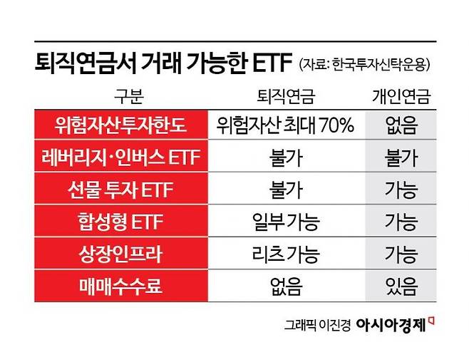 퇴직연금 계좌에서 매매가 제한되는 ETF도 있다. 퇴직연금에서 투자할 수 있는 ETF는 국내 상장 ETF에 국한돼 있다. 해외에 상장된 ETF는 투자할 수 없다. 따라서 해외 증시의 지수를 추종하는 ETF에 투자하려면 국내 증시에 상장돼 있으면서 해외 지수를 추종하는 ETF에 투자해야 한다.