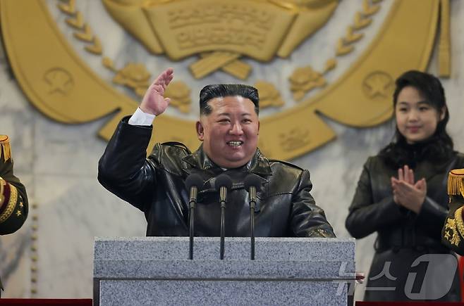 (평양 노동신문=뉴스1) = 북한이 25일 제9차 노동당 대회 폐막을 기념하는 열병식을 평양 김일성광장에서 개최했다. 김정은 노동당 총비서는 연설에서 "우리 무력은 모든 상황에 준비돼 있다"며 "어떤 세력의 군사적 적대행위에 대해서도 즉시에 처절한 보복공격을 가할 것"이라고 강조했다. 연설하는 김 총비서와 그 뒤로 보이는 딸 주애.