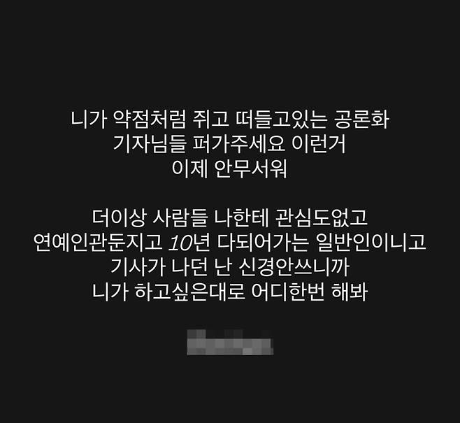 동호는 또 “네가 뭐가 불안해서 그러는지는 모르겠지만 그렇게까지 일 시끄럽게 만들고싶으면 그렇게 해”라며 “공론화 이제 안 무섭다. 연예 활동 그만 둔 지도 10년 다 되어가는 일반인이다. 기사가 나와도 신경 안 쓰니 하고 싶은대로 다 해보라”고 강경한 입장을 내비쳤다.