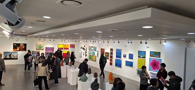 | ▲ 제8회 히즈아트페어 1층 전시장 지난 25일, 제8회 히즈아트페어가 열리는 서울 인사동 인사아트프라자갤러리 1층 전시장에서 관람객들이 작품을 감상하고 있다. |