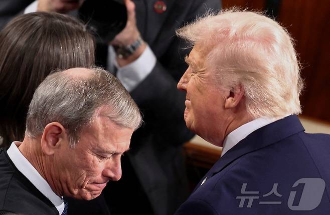 (워싱턴 로이터=뉴스1) 강민경 기자 = 도널드 트럼프 미국 대통령(오른쪽)이 24일 워싱턴DC 의사당에서 국정연설을 하기 전에 연방대법원 대법관들과 조우하고 있다. 왼쪽은 존 로버츠 대법원장. 2026.2.24