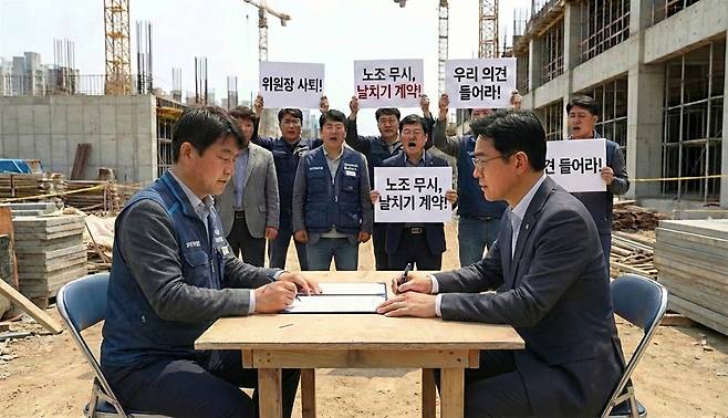 | ▲ 조합원들의 의견을 무시한 노조위원장 이미지 (AI 생성) |