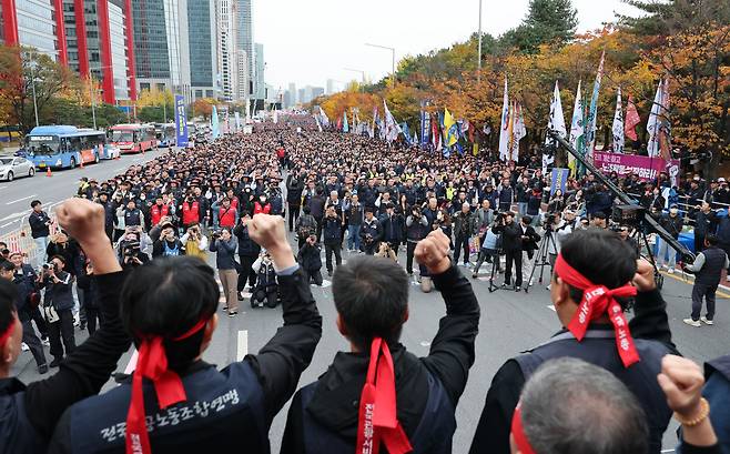 | ▲ 지난 11월 전국노동자대회에서 구호를 외치고 있는 노동조합원들 (본 기사와 관련 없습니다). |