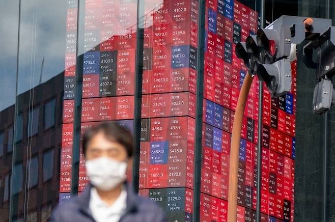 [붉게 물든 닛케이지수 현황판 (도쿄 AFP=연합뉴스)]