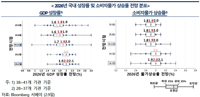 주요 예측기관의 올해 국내 성장과 물가 전망치 중윗값는 지난 전망시점 대비 소폭 상향됐습니다. IB 등 시장참가자들의 올해 국내 성장률 전망 중윗값은 2.0%로 11월 전망1.9% 대비 0.1%p 높아졌습니다. 소비자물가 상승률의 경우에도 11월 전망1.9% 대비 0.1%p 높아진 2.0%로 나타났습니다.