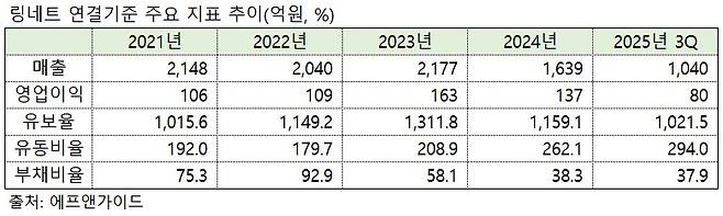 하지만 자사주 잔치 이면에는 본업의 실적 둔화라는 그림자가 깔려 있다. 링네트는 25년간 이어온 성장 가도에 경고등이 켜졌다. 2022년 2040억 원을 기록했던 매출액은 2024년 1639억원으로 급감하며 2000억원 선 아래로 내려앉았다. 지난해 3분기 누적 매출 또한 1040억원에 그쳐 연간 실적 회복이 불투명한 상황이다.
