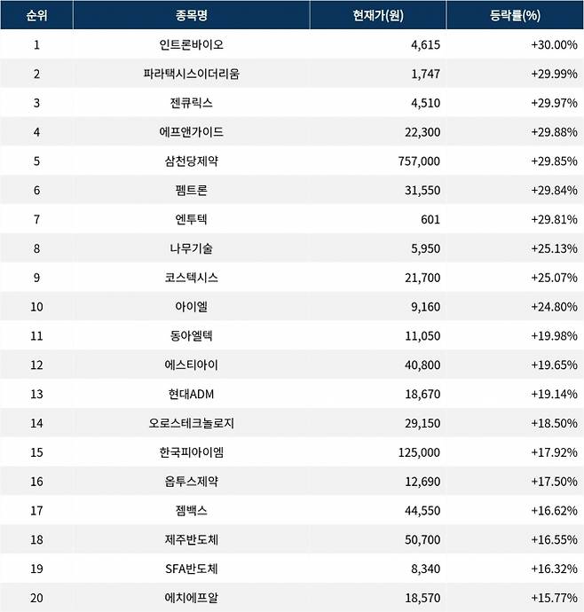 [서울데이터랩]인트론바이오 30.00% 상한가…금일 증시 상승률 1위로 마감