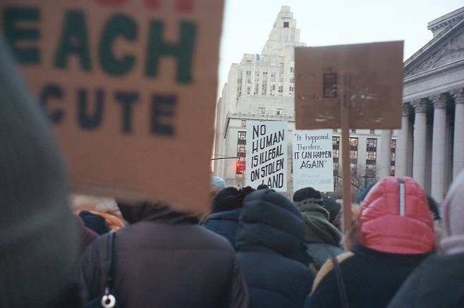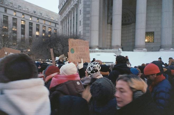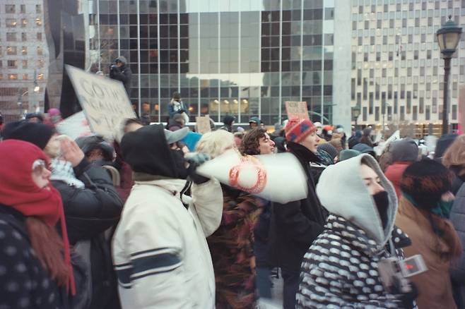 시민들의 구호 소리는 빌딩 숲 사이의 칼바람을 뚫고 전진한다. 내 옆에서 목청껏 구호를 외치던 이는 퇴근길의 간호사였을까, 아니면 대학생이었을까. 그들이 누구였는지는 그들이 누구를 지키려는지보다 중요하지 않았다. 그곳에 모인 2만 5천명중에 배달 기사는 얼마나 있었을까? 도어맨은. 청소 노동자는. 엄마들은. 그날은 전국적인 파업을 요구하는 자리였지만 일을 비울 수 없는 이들이 더 많았을 것이다. 시민들은 슬픔에 지분을 갖는 것이 이 도시에 속하는 법이라는 듯 크게 소리쳤다. “훔친 도시에 불법인 존재는 없다” “우리는 이민자들이 필요하다” “정치의 문제가 아닌 인류애의 문제” “어떤 아이들은 하교 후 엄마가 작별 인사도 없이 떠났다는 것을 안다.”