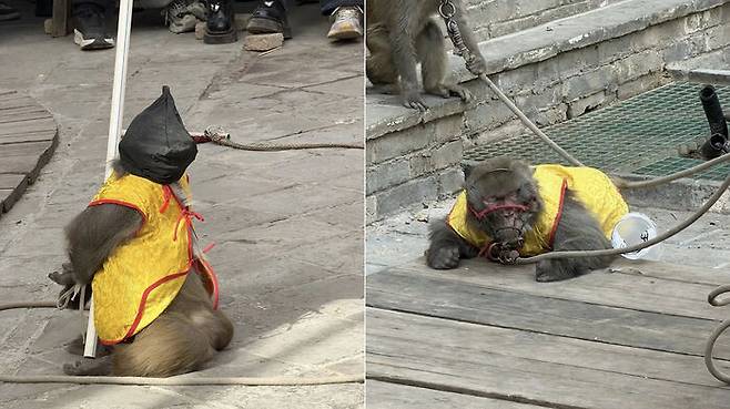 또 다른 사진에서는 원숭이의 입에 금속 재질의 입마개를 채우고 목에는 긴 밧줄을 묶은 모습이 담겼습니다.