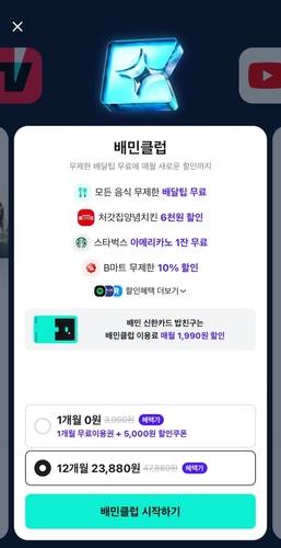 26일 업계에 따르면 배민은 '배민클럽'에 12개월 주기 연간 이용권을 출시했다. 기존 월 3990원이었던 배민클럽 이용료 1년 치를 한꺼번에 결제하는 고객에게 프로모션 혜택을 더해 총 2만3880원으로 제공한다. 이를 월 요금으로 환산하면 기존 월간 구독료 대비 약 49% 저렴한 약 1990원꼴이다. 기존 대비 사실상 '반값'으로 멤버십 혜택을 누릴 수 있는 셈이다.