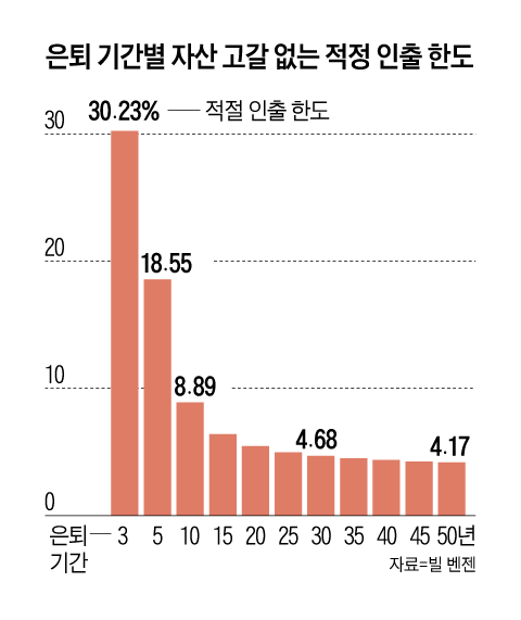 그렇다면 얼마를 모아야 직장을 그만둬도 생활할 수 있을까. 재정 설계사 빌 벤젠은 지난해 발간한 신간에서 “은퇴 후 자산을 연간 4.7%씩 30년 인출해도 생존할 수 있을 때”라고 분석했다. 은퇴 자산 인출 전략 연구로 유명한 그는 1994년 미국재무설계사협회(FPA)가 발행하는 ‘재무설계저널’에 ‘4%의 규칙’을 발표했지만, 지난해 기준을 4.7%로 높였다. 연간 물가 상승률이 예상과 다르기 때문이다. 투자 뉴스 플랫폼 인베스토피디아는 “재정적 자유란 직업이 없어도 생활비를 충당할 수 있을 만큼 충분한 재산이나 안정적인 수입을 갖는 것을 의미하지만, 중년이 되어 경제적 자유를 누리는 사람은 드물다”고 보도했다.