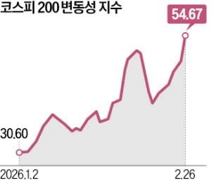 26일 한국거래소에 따르면 이날 코스피200 변동성지수(VKOSPI)는 전 거래일 대비 10.29% 오른 54.67을 기록했다. 8거래일 연속 상승이다. 이 지수는 코스피200 옵션 가격을 토대로 한 달 뒤 지수 변동성을 예측하는 지표다. 통상 50을 넘으면 ‘극단적 공포’ 구간으로 해석한다.
