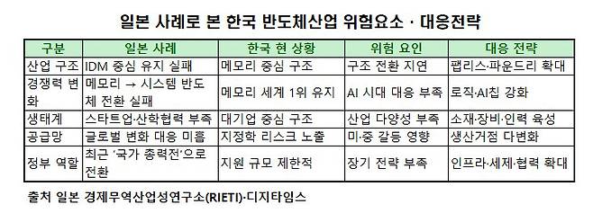 이러한 일본 사례는 기술 우위만으로는 반도체 패권을 계속해서 유지하기 힘들다는 점을 시사한다. 한국 역시 메모리 반도체 의존도가 높다는 점에서 구조 전환기에 유사한 위험을 맞이할 수 있다는 우려가 제기되고 있다.