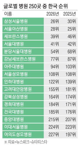 국내 주요 병원이 글로벌 시사 주간지 뉴스위크가 실시한 '2026 세계 최고 병원' 평가에서 약진했다.