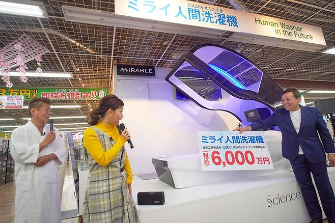 [도쿄=AP/뉴시스] 26일 일본 도쿄의 한 전자제품 판매장에서 ‘미라이 인간 세탁기’ 공개 행사가 열려 가전 유통업체 야마다 홀딩스의 사사자와 준 선임고문이 가격표를 들어 보이고 있다. 일본 가전업체 사이언스가 제작한 '인간 세탁기'는 누워만 있으면 약 15분 만에 샤워부터 건조까지 해 주는 기계로 가격은 6000만 엔(약 5억5000만 원). 2026.02.26.