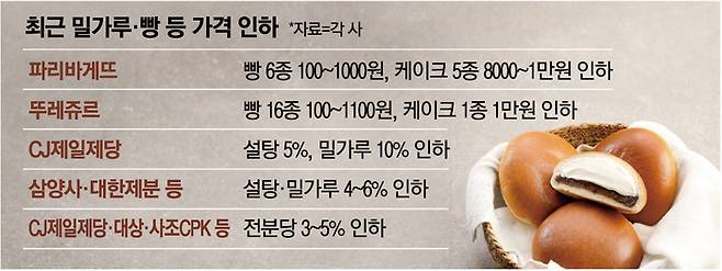 제빵업계까지 가격 인하에 동참한 것은 정부의 담합 조사 이후 밀가루·설탕·전분당 가격이 잇따라 내려간 영향이 크다.
