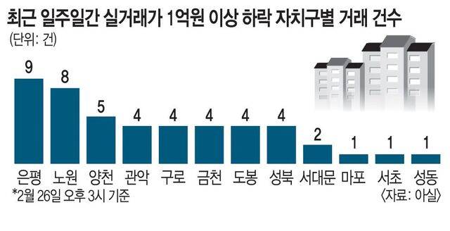 실거래가 1억원 이상 하락 거래는 은평구에서 9건으로 가장 많았다.