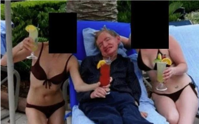 해당 사진에는 호킹이 선베드에 누워 있고 그의 양옆에서 비키니를 입은 여성들이 칵테일을 든 채 포즈를 취하는 모습이 담겼다.