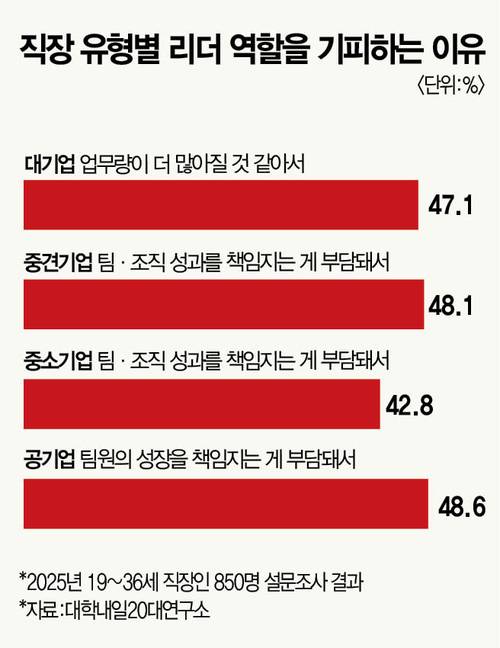 대학내일20대연구소가 지난해 전국 19~36세 직장인 850명을 대상으로 설문조사한 결과, 직장에서 리더 역할을 맡지 않을 경우 “불안하지 않다”는 응답이 47.3%에 달했다. “불안하다”는 응답(22.1%)보다 두 배 이상 많은 수치다.