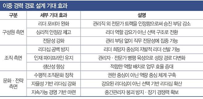 전문가들은 ‘이중 경력 경로 설계’와 ‘권한·보상 재설계’를 해법으로 제시한다. 리더 역할을 맡지 않더라도 전문성, 성과에 따라 실력을 인정받는 구조를 만들고, 리더에게는 책임에 상응하는 실질적 권한과 보상을 부여하는 재설계가 필수다.