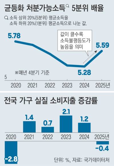 고소득층의 소득이 가파르게 상승하면서 5분위 가구의 평균 소득을 1분위 가구 소득으로 나눈 ‘균등화 처분가능소득 5분위 배율’은 5.59로 집계됐다. 이는 2021년 4분기(5.71) 이후 가장 높은 수치로 소득분배 격차가 더 벌어지고 있음을 시사한다.