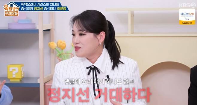 이에 정지선은 "사실 '냉부해'에 박은영 셰프와 출연했는데 댓글에 요리 이야기 하나도 없고 '정지선 거대하다'라는 댓글이 너무 많더라. 그런 거 신경 안 썼는데 충격을 받았다"며 이번에도 비교적 아담한 체형의 이문정 옆에서 비교될까봐 걱정된다고 토로했다.
