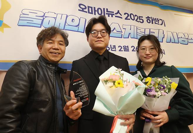 | ▲ 2025년 하반기 올해의 뉴스게릴라상을 수상한 김민석 기자(가운데). |