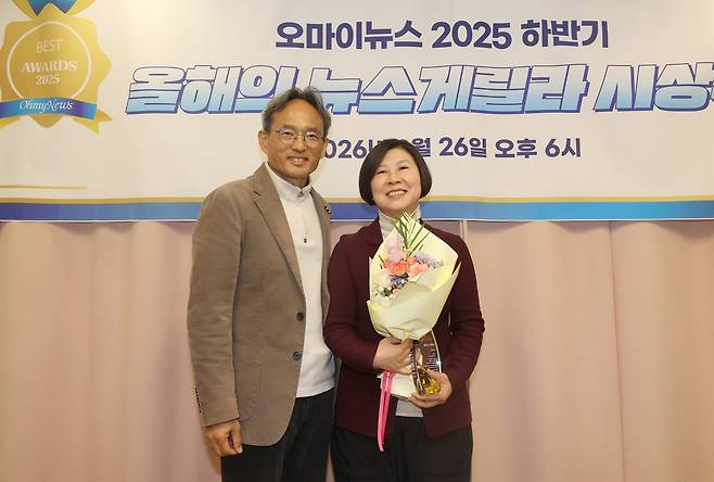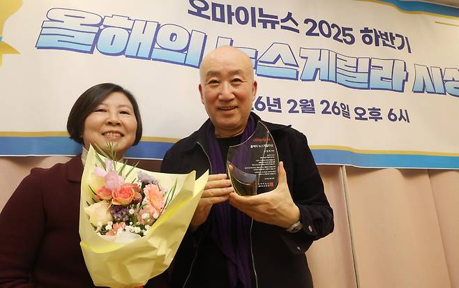 | ▲ 26일 오후 서울 마포구 <오마이뉴스> 서교동 마당집에서 열린 '2025년 하반기 올해의 뉴스게릴라상 시상식'에서 수상자인 최경숙 기자가 오연호 <오마이뉴스>대표와 기념촬영을 하고 있다. |