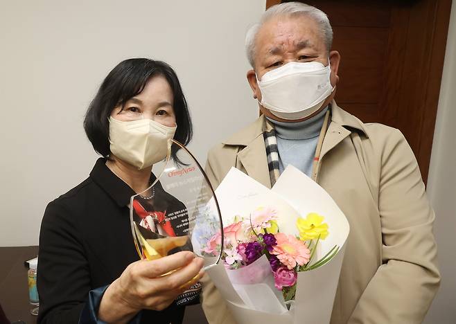 | ▲ 26일 오후 서울 마포구 <오마이뉴스> 서교동 마당집에서 열린 '2025년 하반기 올해의 뉴스게릴라상 시상식'에서 수상자인 유영숙 기자가 오연호 <오마이뉴스>대표와 기념촬영을 하고 있다. |